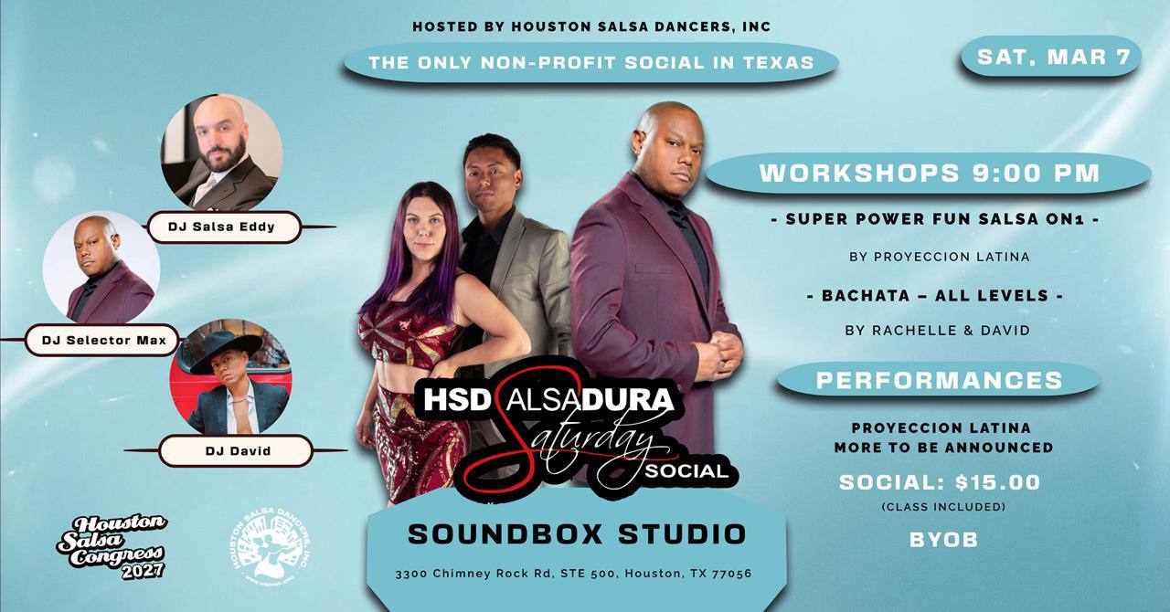 *********** The HSD Salsadura Saturday Social’s are the only nonprofit event each month where you have an opportunity to make a difference in someone’s life just by dancing! http://houstonsalsadancers.org/donate/ Proceeds from the monthly HSD Salsadura Saturday Socials and the annual Houston Salsa Congress help support the HSD Scholarship Program and other community events!
